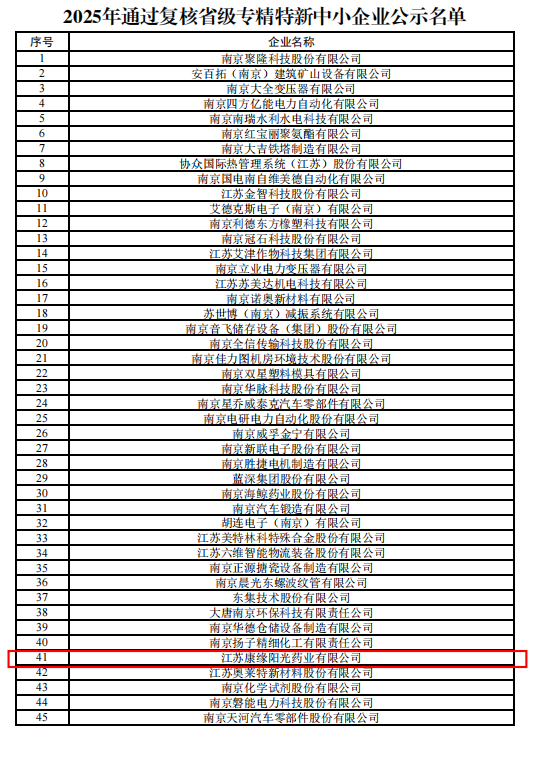 2025年12月12日,江苏康缘阳光药业有限公司凭借在骨伤科及心脑血管领域中成药研发、生产与销售方面的深厚积淀,以及在专业化、精细化、特色化、新颖化领域的卓越表现,成功通过了江苏省工信厅组织的省级专精特新中小企业复核。这一荣誉,是政府主管部门对公司中医药创新实力、市场竞争力和高质量发展成效的权威认可,更是对全体员工坚守匠心、传承创新的极大鼓舞。